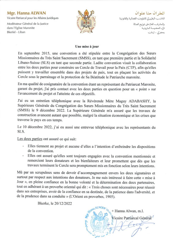 SLS n'a aujourd'hui aucune responsabilité juridique ni financière dans CPP. Pour plus d'informations, voir le document de Mgr Hanna ALWAN.